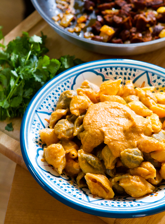 * Spicy Chipotle Shells and Cheese + vegan sausage on top.