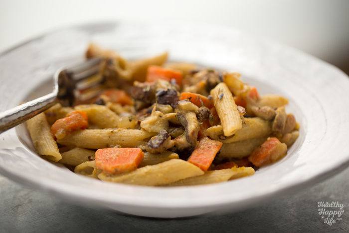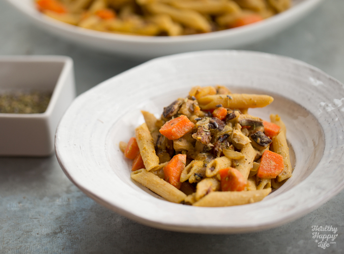 - If you have not yet drained the pasta, do so now and add the cooked carrots and pasta to a large mixing bowl. Pour the blended garlic sauce over top and add the nutritional yeast. Toss well. Then fold int he veggie mixture.