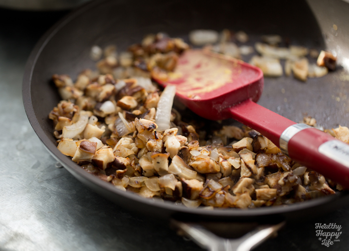 - While the pasta is cooking you can be sauteing the veggies. Warm a skillet over high heat. Add the teaspoon of EVOO and then the onion and mushrooms. Saute until the edges start to brown and onions caramelize. Add the salt and pepper just before turning off the heat. Optional: Add a few pinches of freshly chopped parsley to this mixture as well as a splash of white wine.