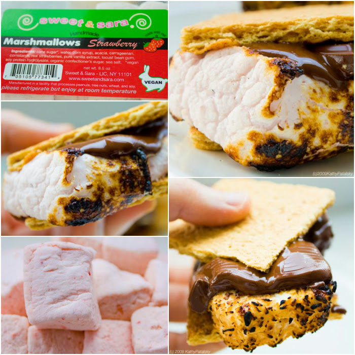 My First Taste. The first time I tried Sara's marshmallows I was in heaven. I picked up a container of the strawberry flavor and bit into the fluffy square confection. Bliss! Like biting into a pink strawberry cloud with vegan sugar on top. Unlike most marshmallows, you really can eat these all on their own and the flavor, texture and design holds up as a singular amazing dessert treat. See the strawberry smores I made using Sara's marshmallows.