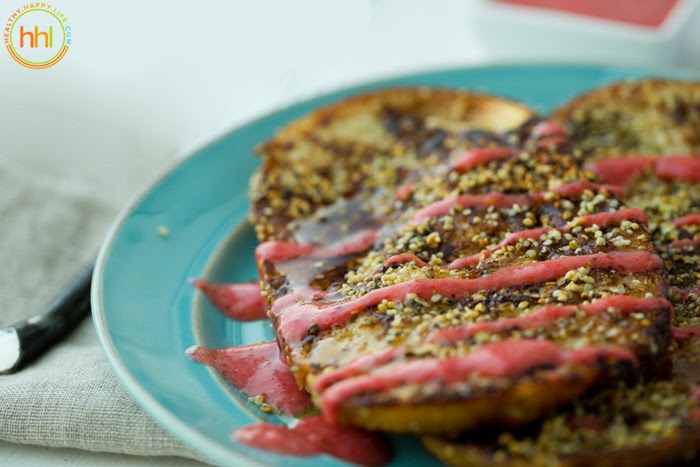 1. Protein. Some might say that since the vegan version does not contain eggs, it is lacking in protein. Well there are a few easy solutions to that. You could whisk in some vegan protein powder to the soaking liquid. You could sprinkle some protein-rich hemp seeds over top, like I did for today's recipe. Or you could slather on some almond or peanut butter to serve. OR you could add some silken tofu as an egg replacer - using it in place of non-dairy milk.