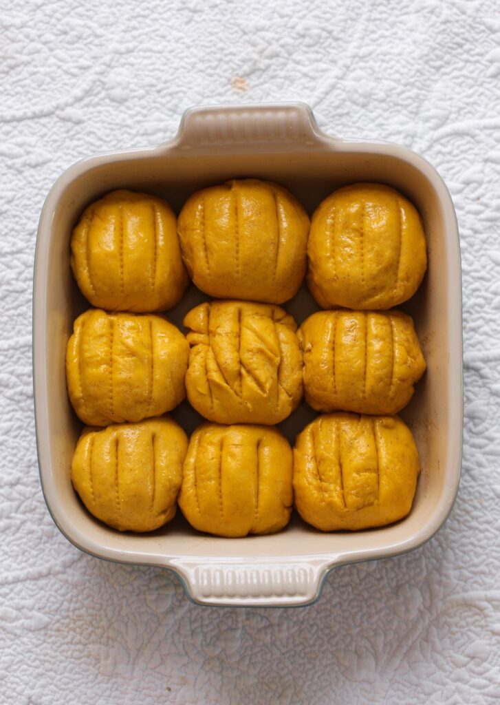- Using your hands, roll the dough pieces into balls. Stretch the smoothest side of the dough so it faces up in a nice round shape. Fold the excess dough at the bottom. Tuck the dough ball into the baking pan. Repeat with all the dough. Optional: Score tops of the dough with a knife if you want patterned lines.