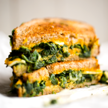 Toasty and warm, melty vegan cheese in every bite, this Spinach-Stuffed Grilled Cheese, aka the "Popeye" grilled cheese, is just what you are craving in a decadent yet veggie-accented melty-cheese sandwich.