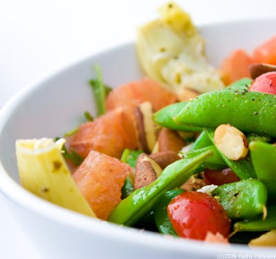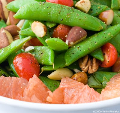 In my recipe for Sugar Snap Pea Maple Nut Salad, I add some sweet-tart grapefruit, a mix of my favorite nuts and a salty sweet apple cider vinegar, EVOO and maple dressing. The flavor is complex, refreshing, delicate and definitely cravable. I will be making this again, and again, and again. Plus I have a secret for getting the peas that bright vibrant green color.