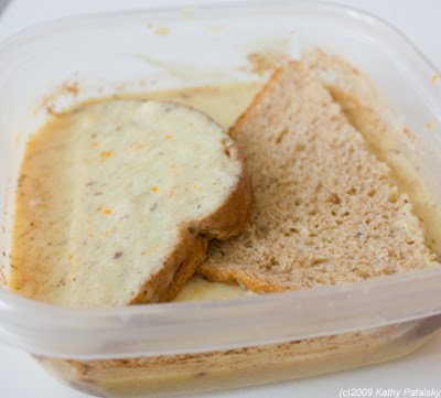 4. You don't want to over-soak your bread, however soaking it through is important. Using bread that isn't perfectly fresh may be the best way to combat french toast sog. But then again, I used a fresh loaf and it turned out splendidly. Dipping process: Dip and soak for 2 seconds on each side and immediately transfer to hot oiled pan. Repeat until your pan is filled to the brim with toasts. My pan held 5 triangles at a time.