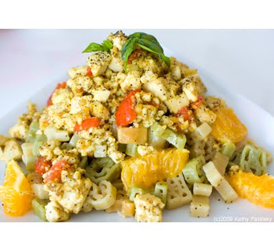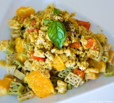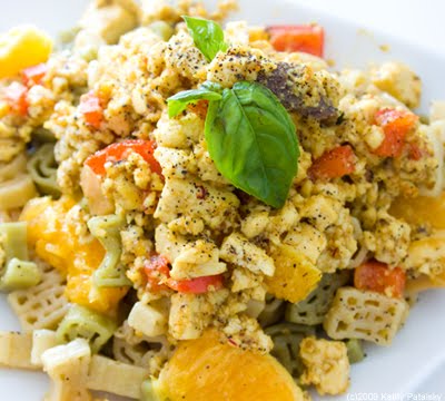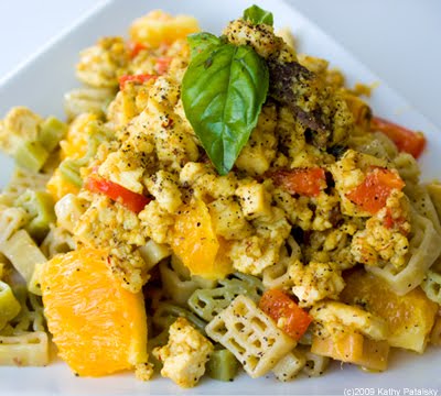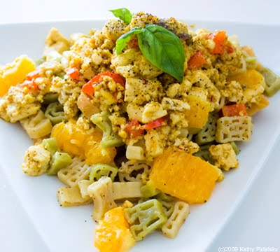 Why Not Just Bread? It's true that the basic components of pasta (carbohydrates) are similar to that of say whole wheat or grain toast, breads or muffins. But the big difference is the water content. Pasta is water dense and thus a better tummy filler than toast or dry cereal. It will warm you up and keep you feeling satisfied throughout the day. And adding a nice big scoop of scrambled tofu gives you that protein boost you crave in the morning. The protein also helps 'complicate' the nutrient profile of the meal-which is a good thing for optimal nutrition! After all, just a big 'ol plate of pasta is not my idea of a balanced meal. But add in the oranges, tofu and veggie accents and you are headed for the honor roll!