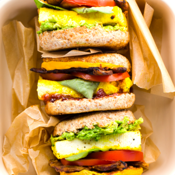These Vegan Breakfast Sandwiches with "eggy" tofu, smashed avocado, melty vegan cheddar cheese and more are a favorite in our house. The pan-fried tofu, yellow-tinted, has a signature spongy texture that mimics a scrambled egg - only lighter and fluffier even!