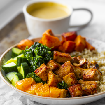- Build Your Bowl: Add the rice and kale side by side. Then on top add: tofu, sweet potatoes, cucumber, citrus, optional cashews and anything else you might want to add to your bowl. Drizzle some dressing over top and serve!