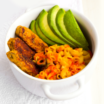 - Begin plating your meal. Add the warm mac and cheese to a bowl. Place the tempeh around the edges and add a fan of the avocado slices. Drizzle a generous amount of hot sauce over top. Serve warm.