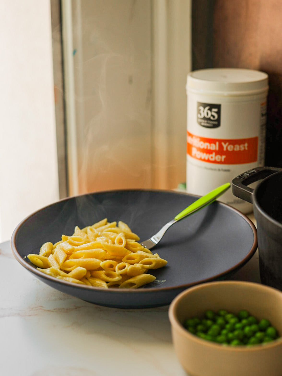 - Add in the vegan butter, optional olive oil and nutritional yeast. Add more nooch to taste as desired. If adding veggies, you can also mix them in here or serve on the side. Cooking veggies: I simply add them to my pasta pot 2 minutes before cooking is complete.