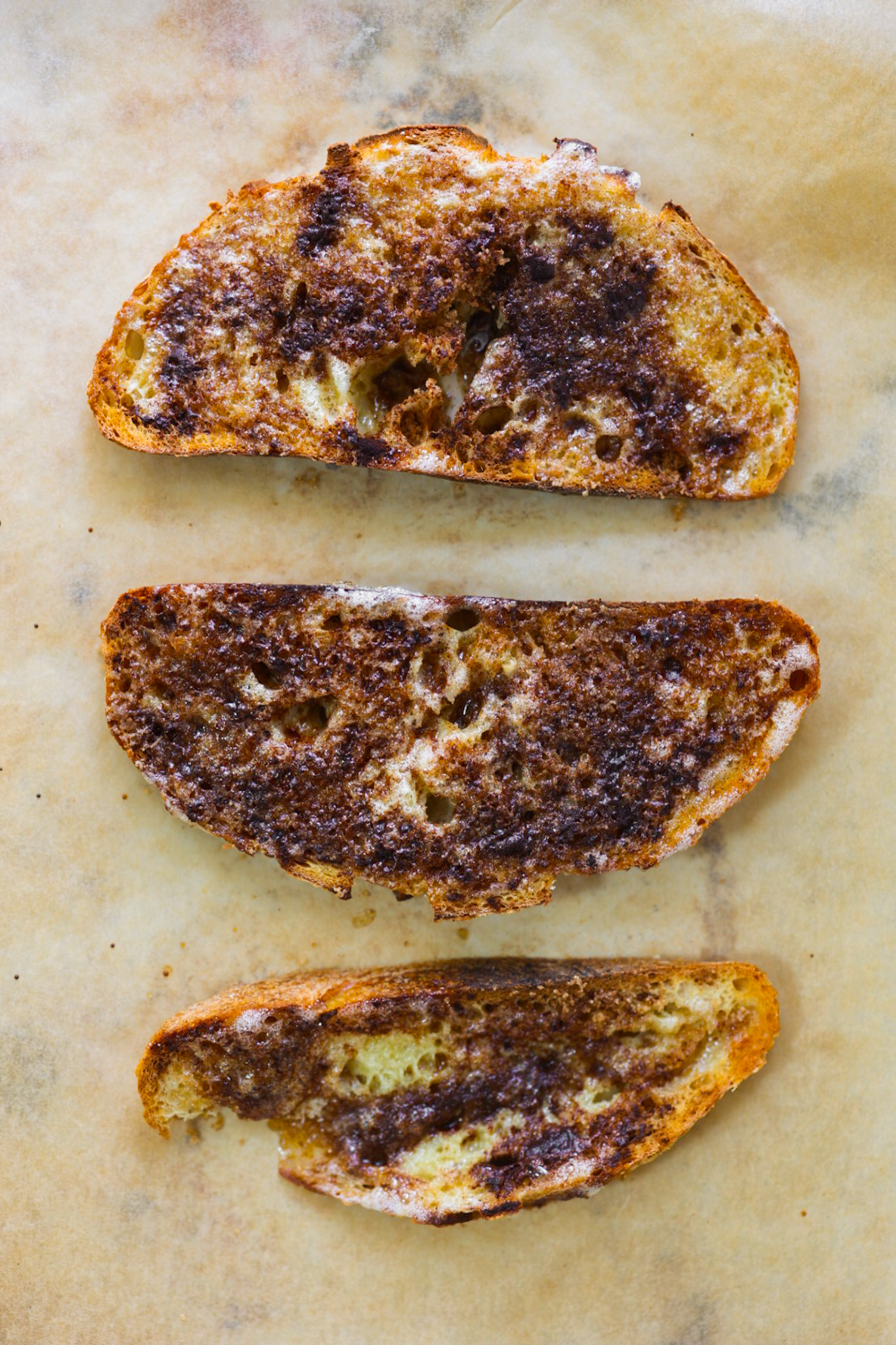 - Soft on One Side: I love toast that is soft on one side (the bottom) and crunchy on the top. To achieve this effect, you ONLY use the oven on broil setting. This way the top caramelizes and gets all crunchy sweet with the butter and sugar, while the bottom side stays soft and fluffy. The edges get browned and crispy too.
