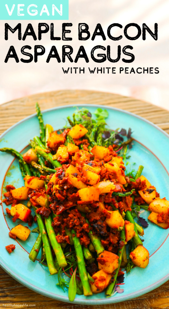 These flavors are bold and cravable. Smokiness from the vegan bacon. Sweetness from the peaches (or apple) and the maple syrup. Then you get some spice from the vegan bacon too. And of course, the basic asparagus accents of apple cider vinegar, salt and pepper and oil really bring everything together.
