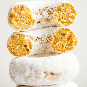 These lovely Vegan Powdered Donuts are perfect for a snack, tea time nibble or light and fun dessert. And if you can find some mini donut baking pans, you can totally re-create the minis! I hope you love this light and lovely dessert just as much as me!