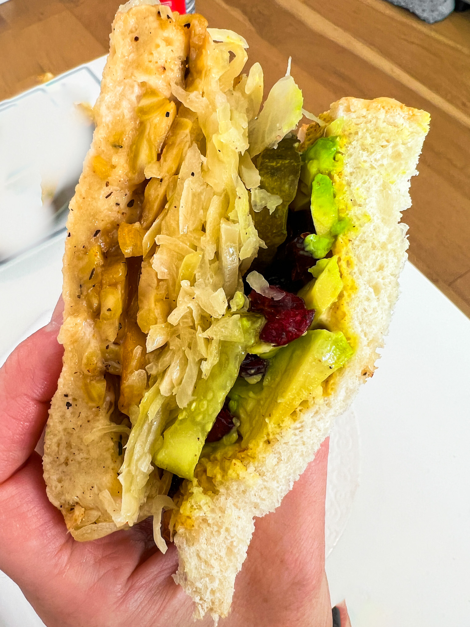 My Vegan Tempeh Reuben is loaded with an array of bold flavors. That savory-sweet tempeh, all sizzling in the pan, caramelized around the peppery edges. Then we have the avocado and warmed sauerkraut. Pickles and sweet dried cranberries for a bit of contrast. I ass spicy mustard and my secret sauce. And lightly toasted bread - I used sourdough - brings it all together.