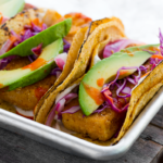 Start assembling your tacos! Use two layered tortillas per taco. Warm tortillas in oven, microwave or stove stop. Add a slathering of the vegan mayo, then add the cabbage, tofu, avocado, pickled onions and optional hot sauce. Serve warm!