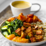 Build Your Bowl: Add the rice and kale side by side. Then on top add: tofu, sweet potatoes, cucumber, citrus, optional cashews and anything else you might want to add to your bowl. Drizzle some dressing over top and serve!