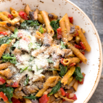Add in the mushrooms and bell pepper. Also add the italian herbs and optional red chile flakes. Cook for another 2-3 minutes, just until the mushrooms are cooked down and their texture begins to caramelize and brown around the edges as well. Fold in the spinach so that it wilts down. (Note: If you want the spinach cooked a bit more, you can add it in earlier with the mushrooms. Try not to get too caught up in when to add which veggies, as long as everything cooks down and absorbs some yummy flavors you should be good!)