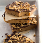 Remove your peanut butter baking sheet from the freezer and pour the chocolate over top, and crumble the filling over top. Place the baking sheet back in the freezer. Chill for about ten minutes.