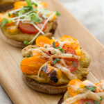 These Roasted Pepper Hummus English Muffin Pizzas with Tomatoes are slathered in rich hummus, topped with melty cheese and fresh tomatoes. Vegan and gluten-free if you use GF bread.