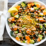 Start building your bowls: Add the peanut kale. Avocado. Sweet potato, citrus, chickpeas and as much cheezy sprinkle as you want. Then drizzle extra peanut sauce over top if desired. Serve with a squeeze of fresh lemon juice over top.
