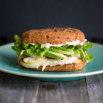 Now the easy part! Assembly. Toast your bread and slather mustard on one side and vegan mayo on the other. Sprinkle the smoky paprika over top the mayo. Remove the lid from your skillet and use a spatula to transfer the chicken to the bottom side of the roll or bun. Add the onions over top that. Then add avocado and lettuce over top and finally close with the top layer of bread.