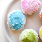 Final step: Frost the cupcakes. Optional: Roll edges in shredded coconut. Serve! Happy Easter, spring or rainbow season.