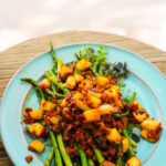 Add in the asparagus, vinegar and maple syrup. Toss a bit and cover with lid. -- A minute or so later, I like to add a splash water here to help cook the asparagus with steam.