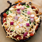 Add tomato sauce to each mushroom. Then top with vegan cheese shreds and any additional veggies or toppings you want.