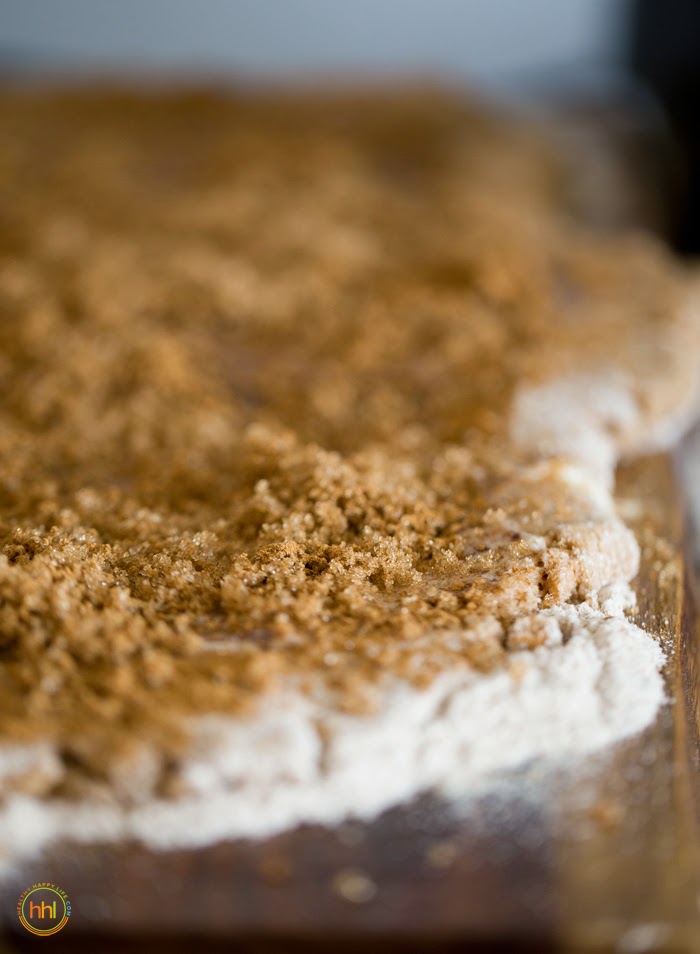 - Sprinkle the sugar evenly over the vegan butter - all over the dough surface. Follow up with the cinnamon, heavily sprinkling it over entire surface of dough so that it covers the surface in a cinnamon blanket.